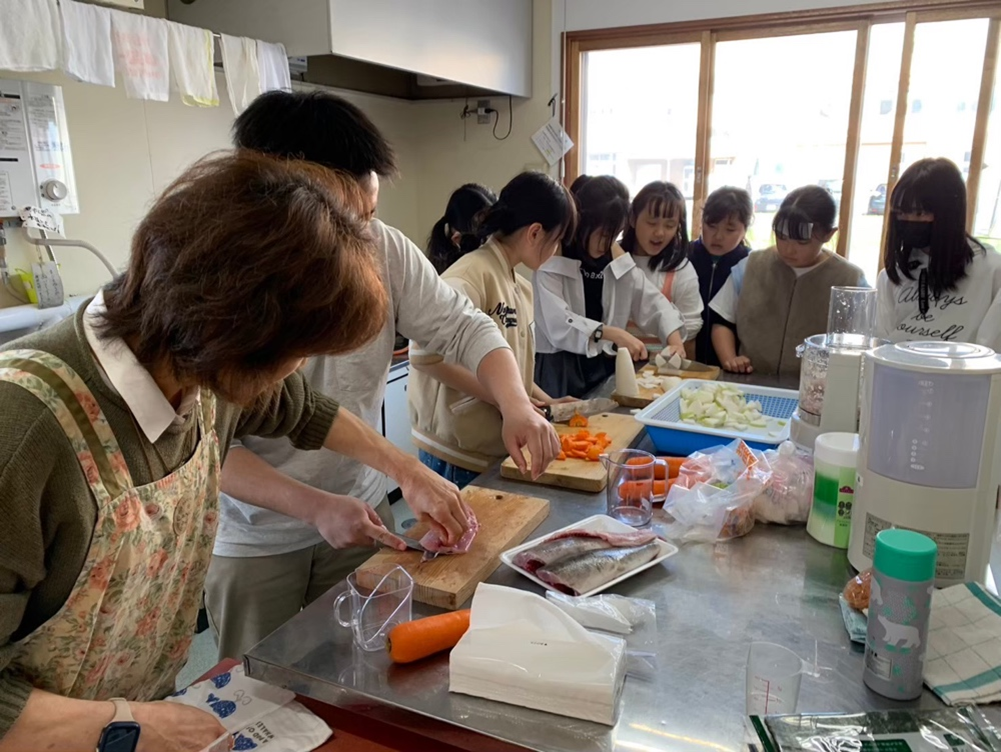 この日のメニューはホッケのすり身汁。野菜を切るお手伝いをしたいこども達が包丁待ちをしています。