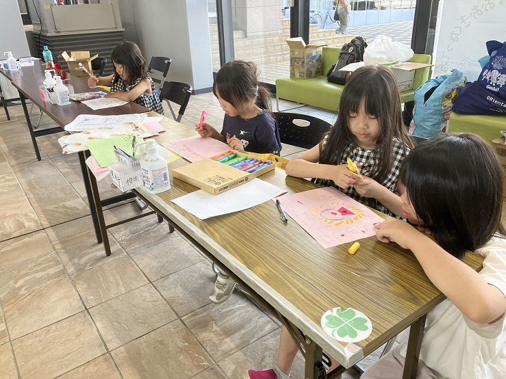 こども服交歓会の前日準備で、会場に貼るポスターを書くこども達