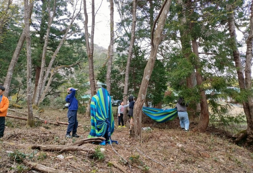 ユースセンターの日に、利用者のこどもが自分で使うハンモックを自分で張っている様子