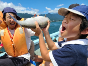 琵琶湖というフィールドで、地域の方と協力した体験を提供し、こどもが笑っています。